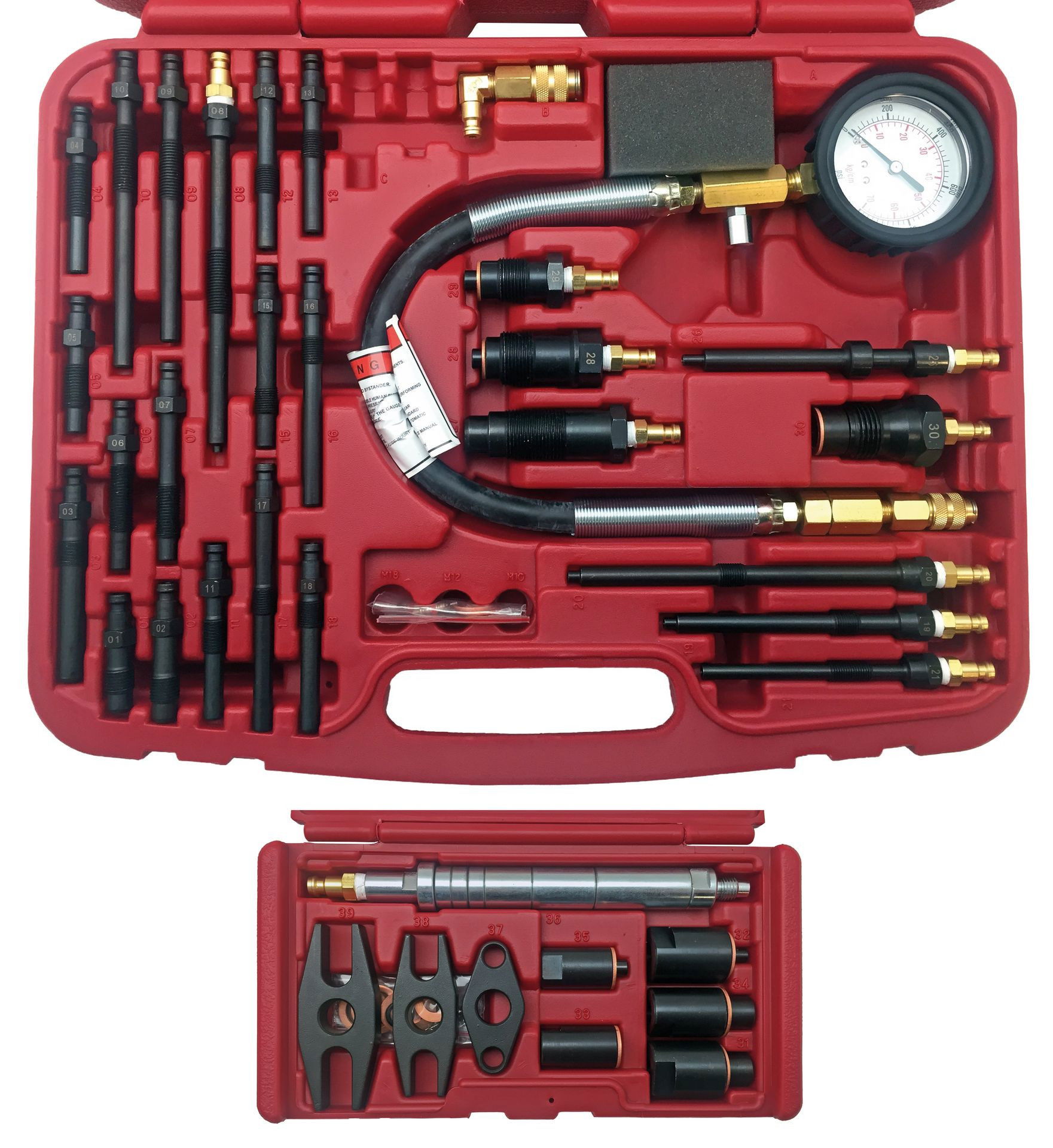 - 6x befecskendező adapter M24, M22 és M20-hoz Nissan, Ford, PSA, Rover, Mercedes, BMW, Land Rover, VAG, Toyota és Vauxhall motorokhoz.
