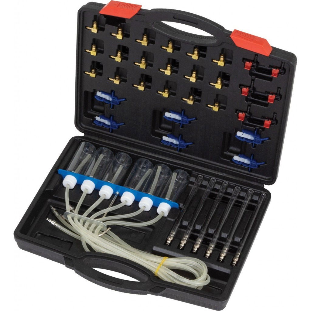 6 db üvegcső, 6 db mérőpatron 60 cm-es összekötő vezetékekkel, alumínium rúdra szerelve horgokkal, 30 db adapter Denso C3, C1, Siemens C3, Delphi, Bosch, stb.