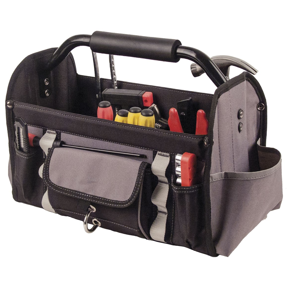 Softshell nyitott szerszámtáska. Könnyű kezelhetőség, strapabíró kivitel. Erősített pánttal, 4 nyitott egy fedett tárolóval, D gyűrűvel, 6 külső és 14 belső rögzítő hurokkal.